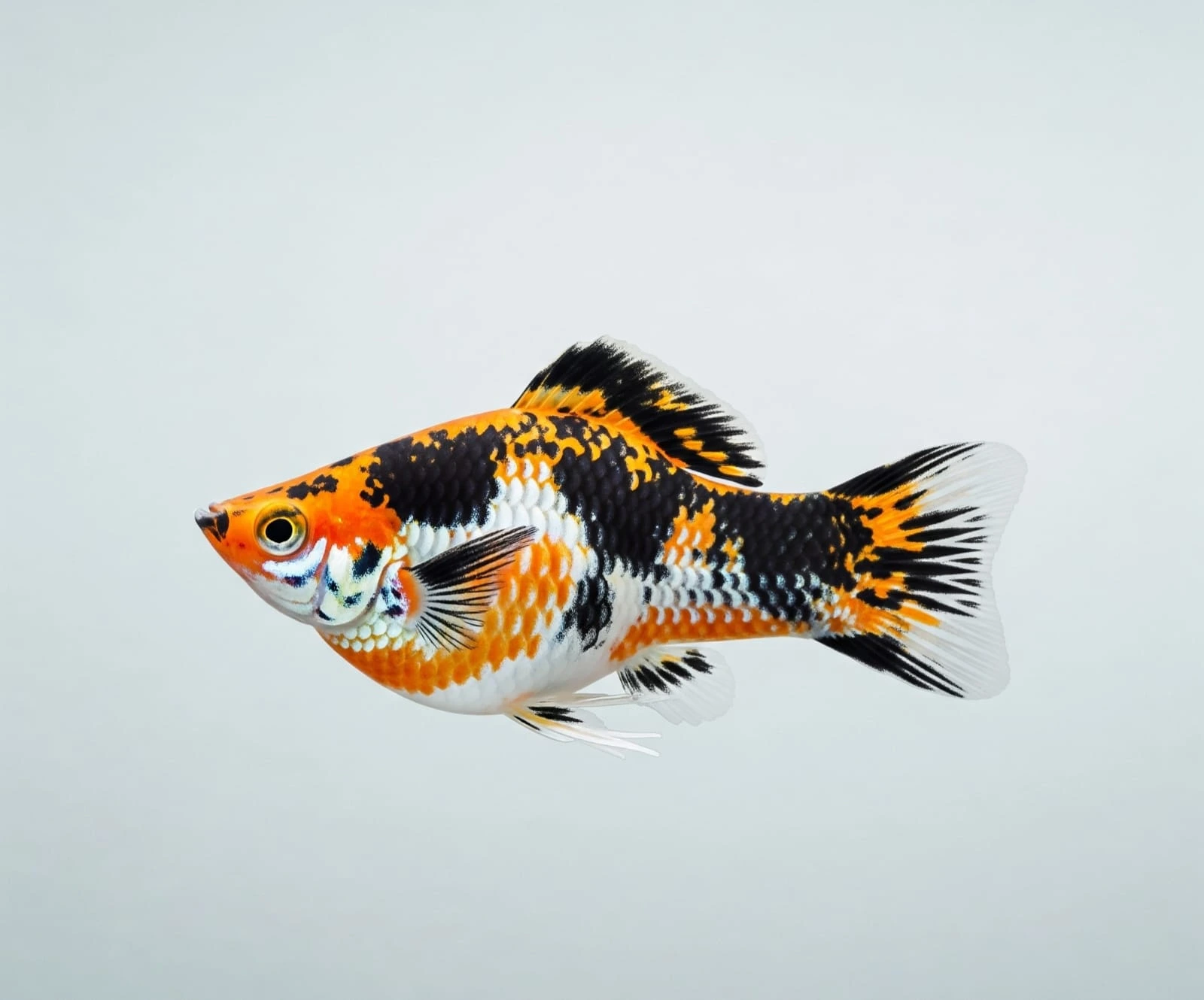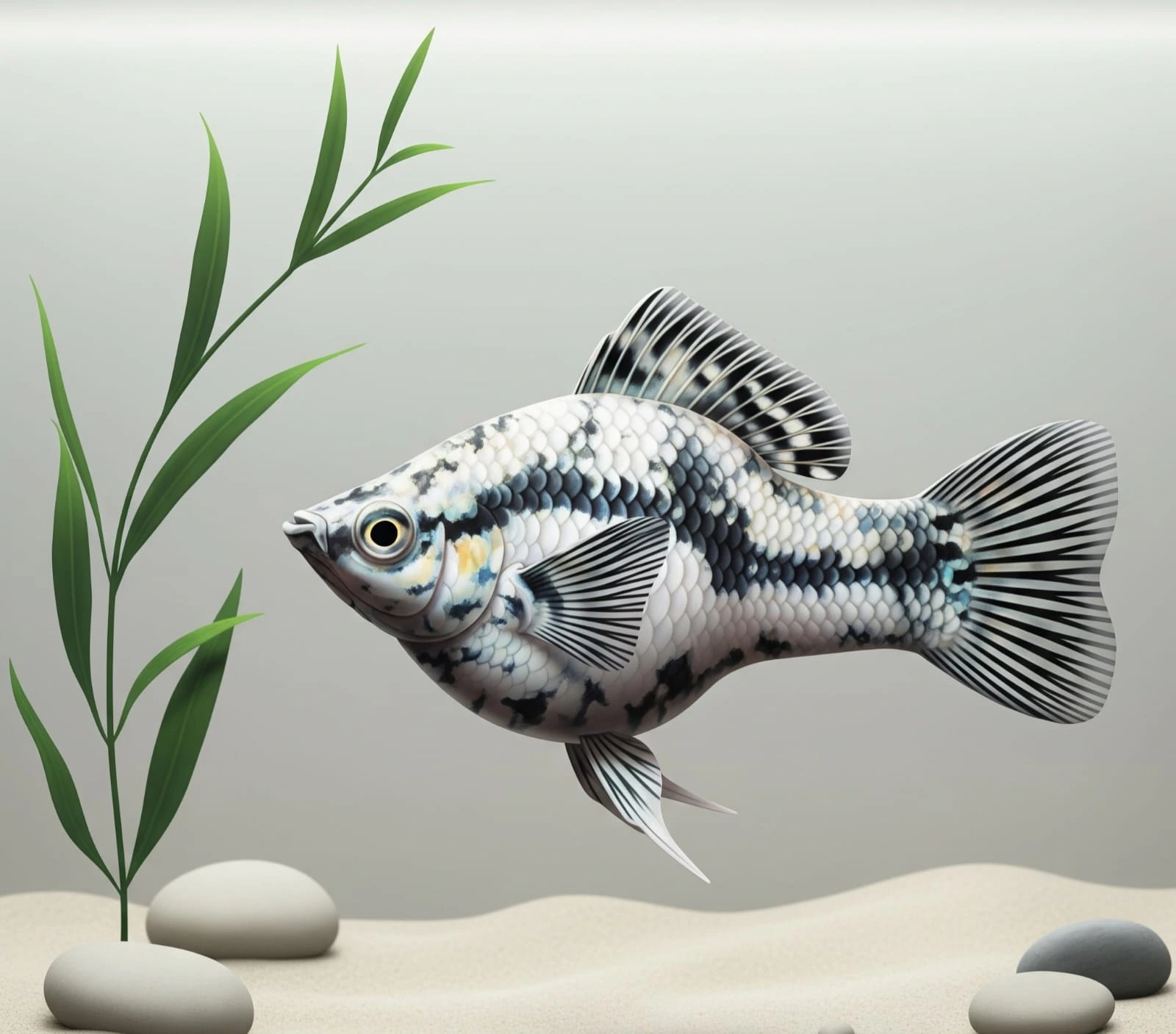 Jenis satu ini cukup beda dari ikan molly balon yang lain, lho. Karena ia mempunyai pola warna khusus atau “Calico”, perpaduan warna dengan totol-totol yang mirip marmer atau kucing calico.